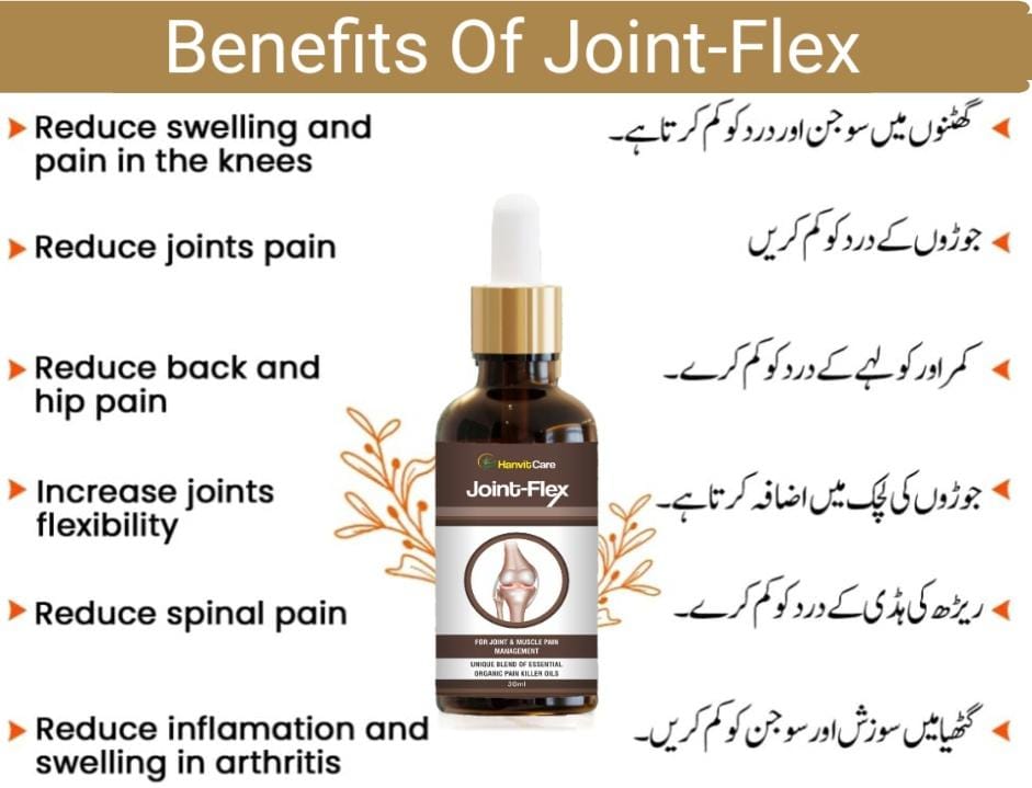 Joint-Flex essential Organic oils blend helps in reducing joints and knee pain, stiffness and swelling. The natural oils work on symptoms of pain in joints, back pain, arthritis pain, knee pain, tennis elbow, strains and sprains during sports or physical activity.